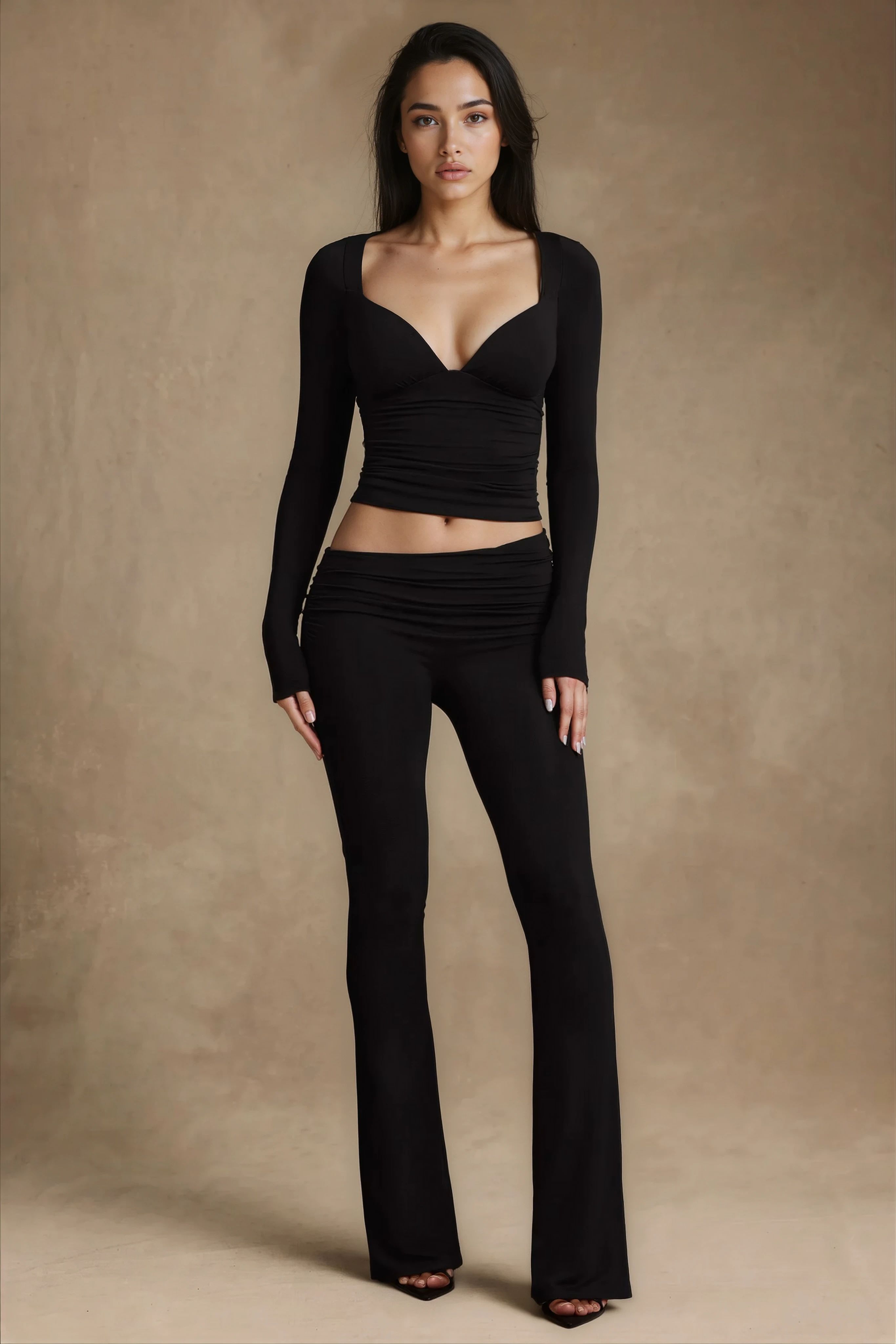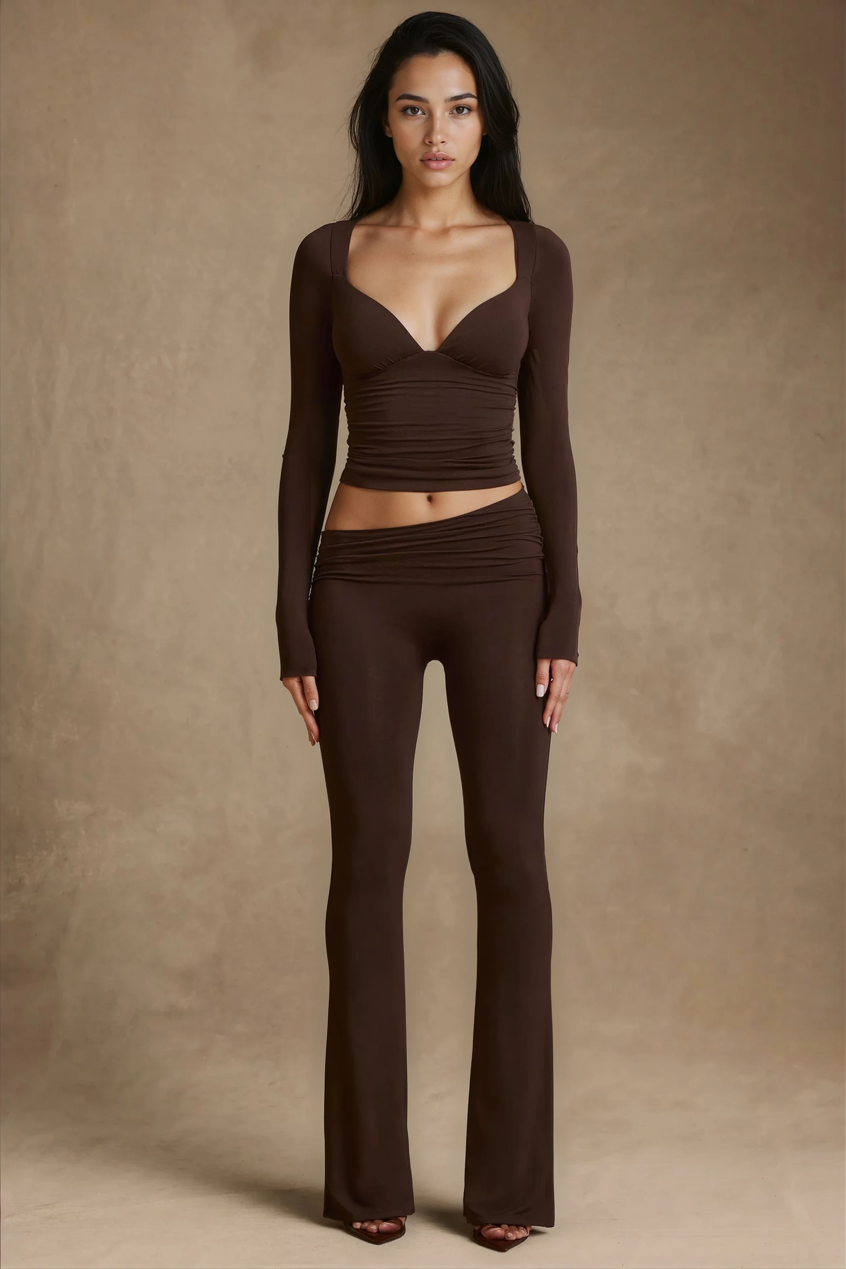 The Auri trousers feature a dramatic asymmetric mid-low rise waistband, ruched side detailing and a timeless flared-leg silhouette. The Cali top complements with a contoured V-neckline, underbust seams and side ruching that enhance its bodycon fit. Worn together, they create a modern yet versatile look that transitions effortlessly from casual days to elevated evenings.