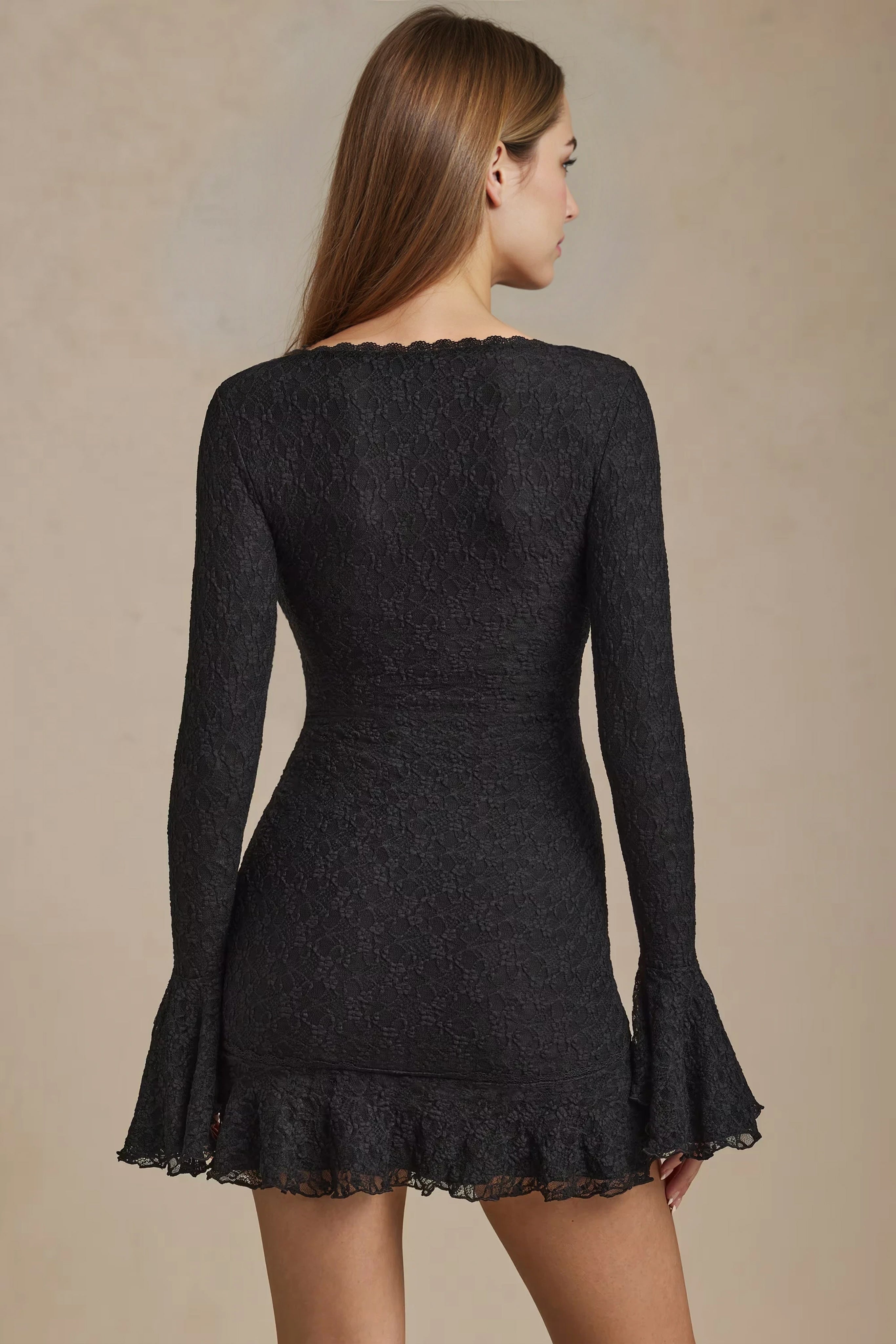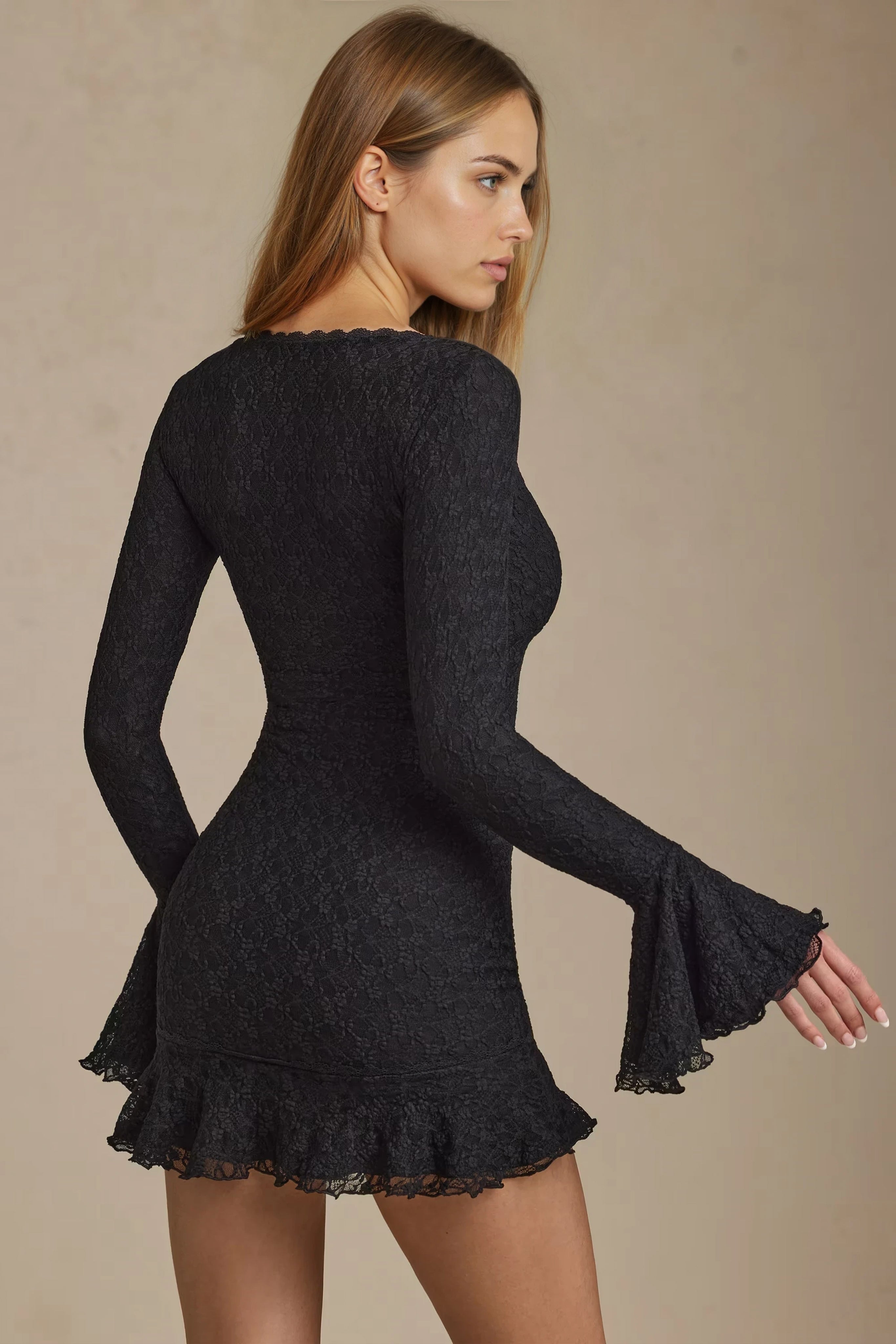 Unlock the secret of daytime elegance with the Nala mini dress. Cut to a figure-enhancing bodycon silhouette with a ruffled skirt and cuffs, it’s crafted from premium floral lace with a touch of stretch for enhanced comfort. It’s framed with a scoop neckline traced with pretty scalloped trims.